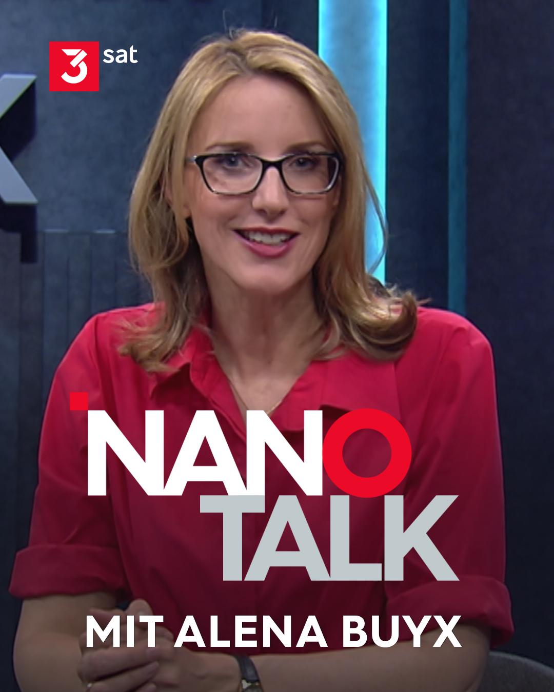 Alena Buyx im NANO Talk-Studio. Oben links das 3sat-Logo. Schlagzeile auf dem Bild: NANO TALK - mit Alena Buyx.