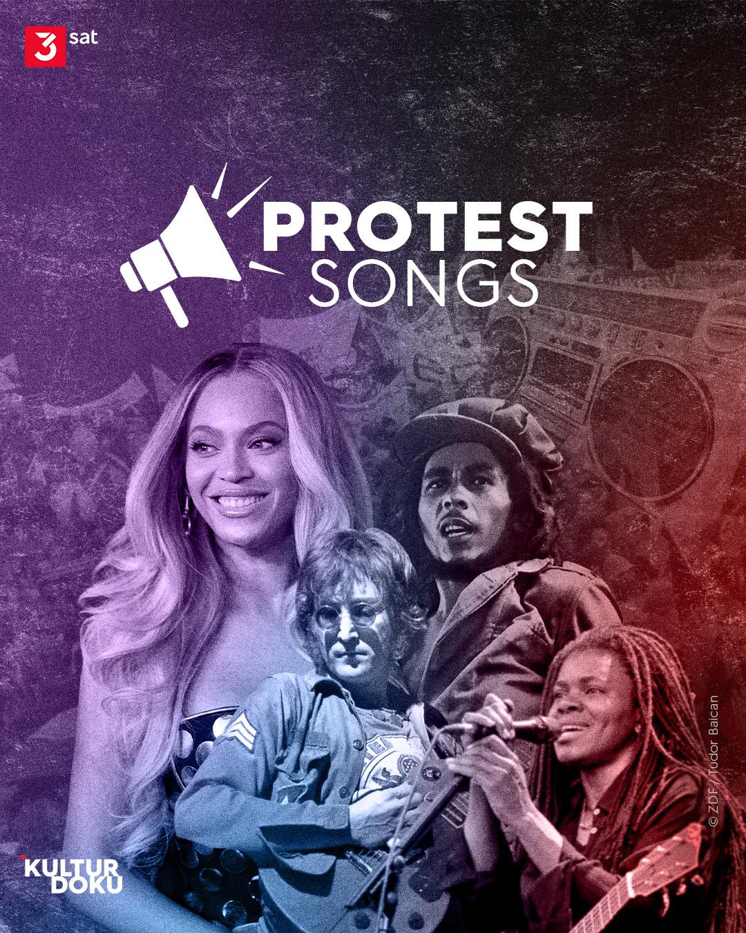 Titelbild mit Logo der Dokureihe: Protestsongs. Montage Portraitbilder von Beyoncé, John Lennon, Bob Marley und Tracy Chapman. Oben links das 3sat-Logo.